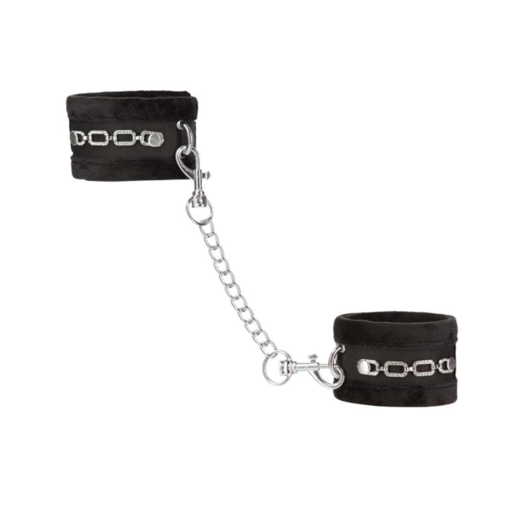 Each soft polyester cuff features crystal-accented metal chains, adding an elegant, glamorous edge to your restraint play.